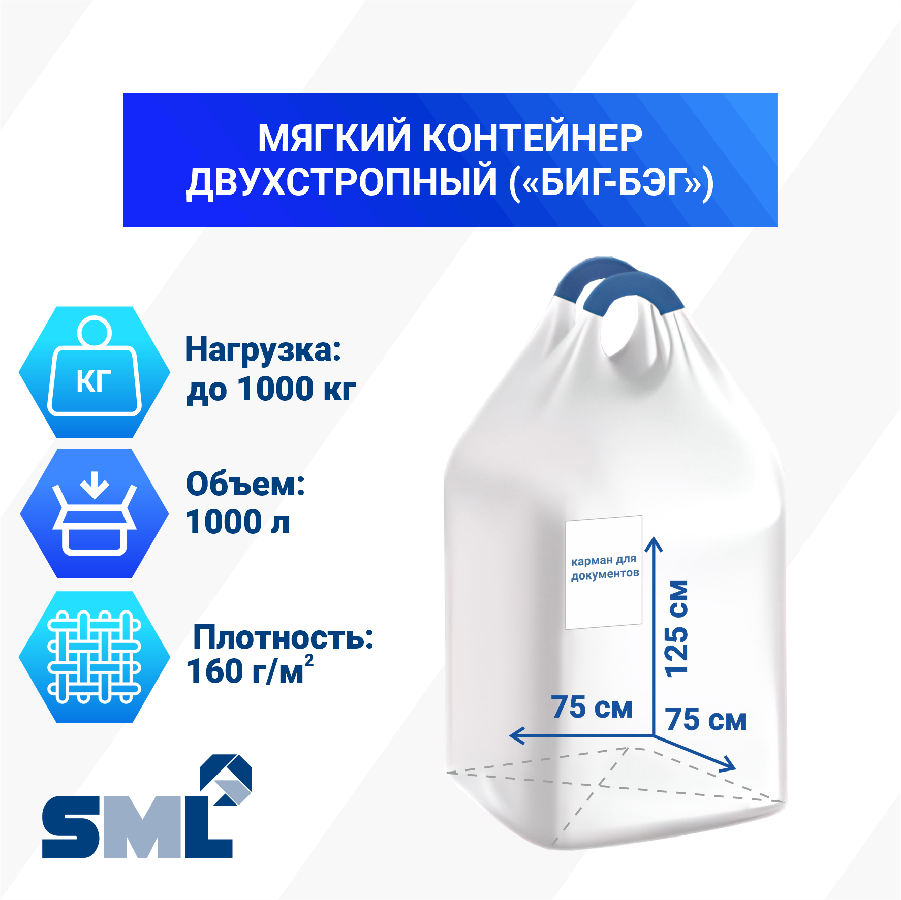 Мягкий контейнер разовый (Биг-Бэг) — упаковочная тара из прочного полипропиленового волокна. Компания «Полимакс» предлагает изделия различной конструкции (верх открытый или со сборкой, низ глухой или труба), 2- и 4-стропные грузоподъемностью до 2000 кг. Каждый мешок снабжен п/э карманом для хранения документации формата А4.