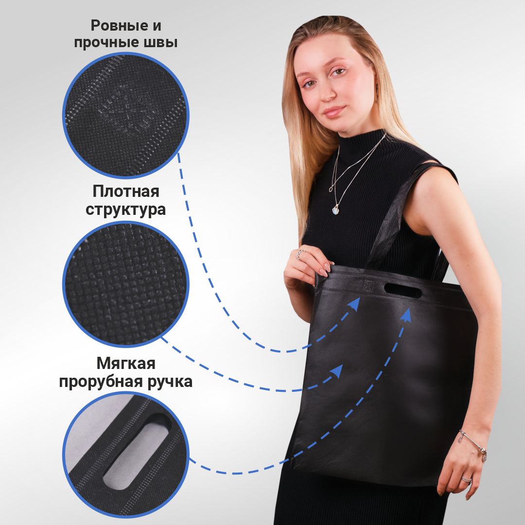 —Сумка-шоппер из спанбонда с пришивными ручками 24 см, черная, 35 х 40 см
