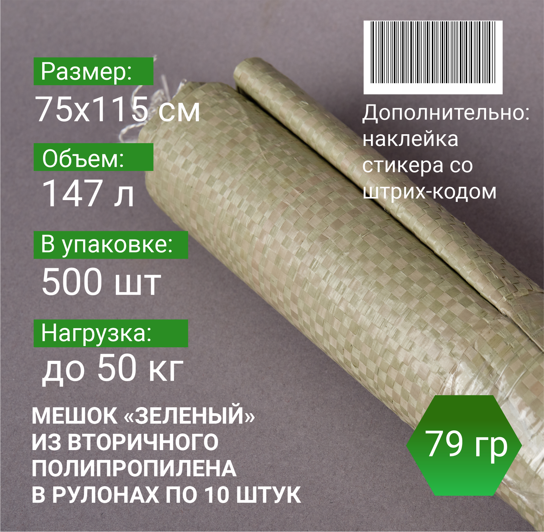 —Мешок п/п зеленый 50 кг, 75x115, 79 г, рулоны по 10 шт.