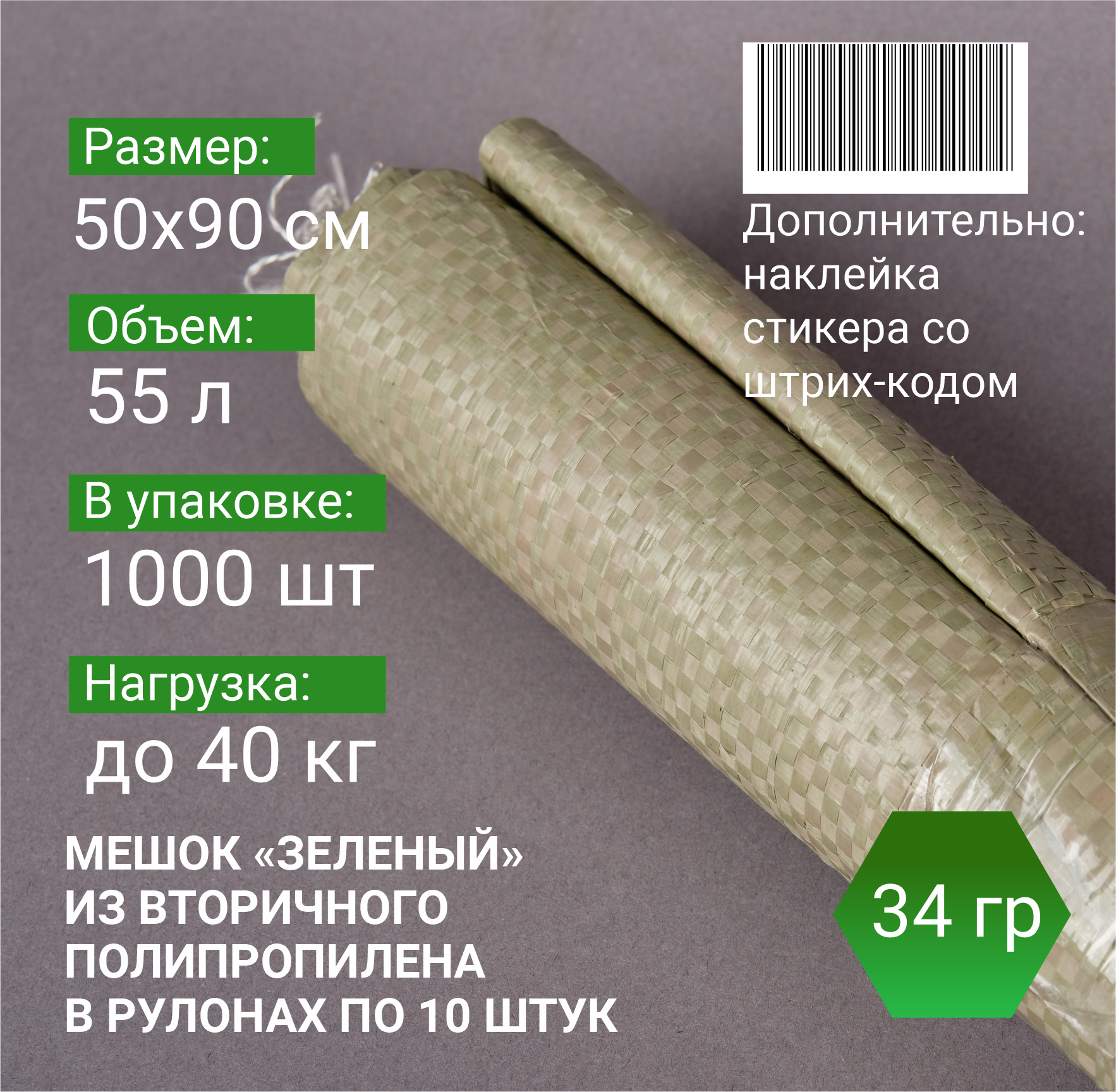 —Мешок п/п зеленый 40 кг, 50x90, 34г, рулоны по 10 шт.
